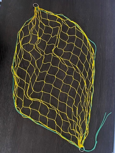Starts with 2 rows of 8 meshes. Increasing to 3x 15 meshes for the middle of the bag. Then decreasing back down to end with 2 rows of 8 meshes.